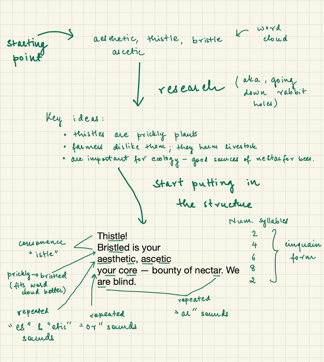 Starting from the word “aesthetic”, I began writing a word cloud. This is a technique I learnt from a poetry writing course I took a few years ago, where you let your mind form word connections based on sounds (more general than rhyming). Once there are enough words on the page, you may start to, then, also see connections in the concepts represented by those words, which may inspire ideas. I started with just two words: aesthetic and thistle, and kept coming back to add to it, as more ideas occurred to me in the next steps.